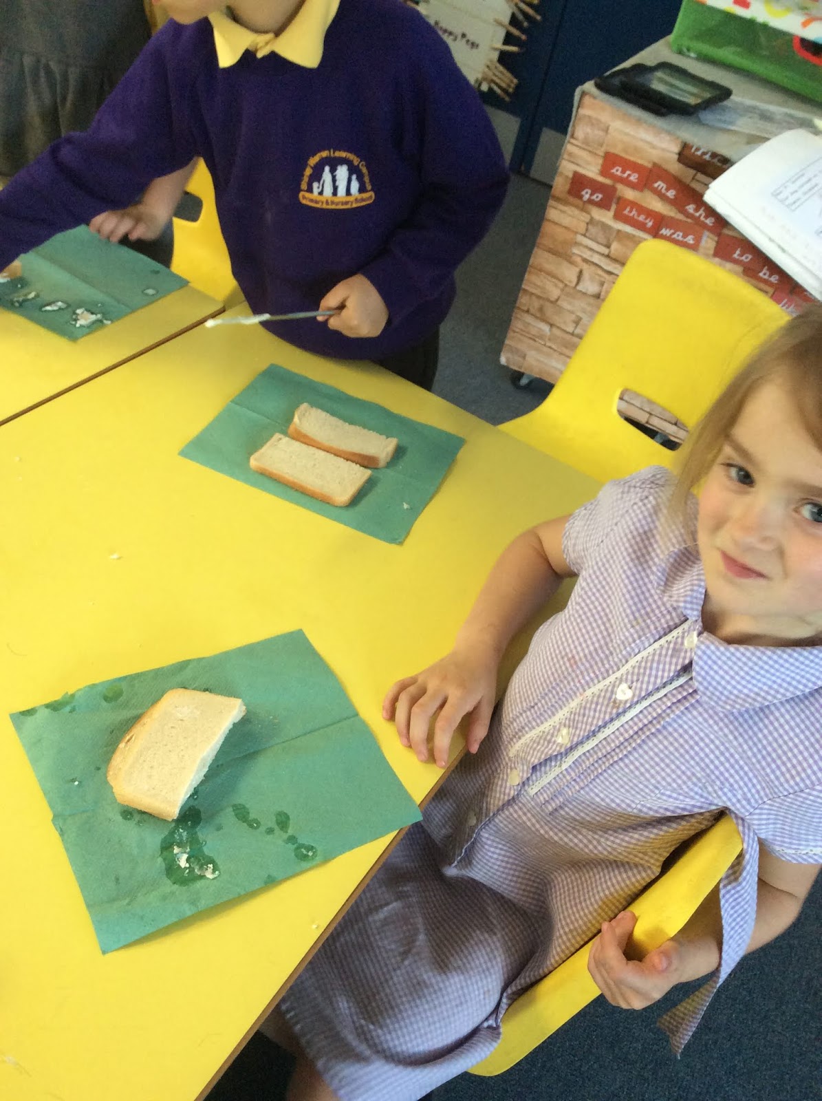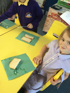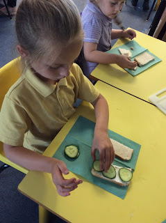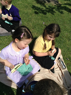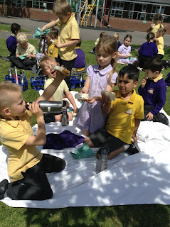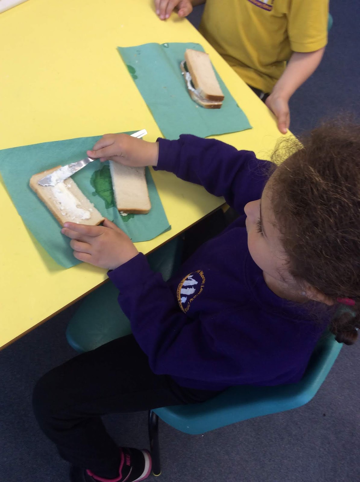 RB had a lovely afternoon having a class picnic outside on the grass. RB gained all their marbles in the jar and voted for a picnic in the sunshine. We made our own sandwiches and got to spread them by ourselves. We sat next to friends in the big playground and played games using the giant scrunchie and parachute.